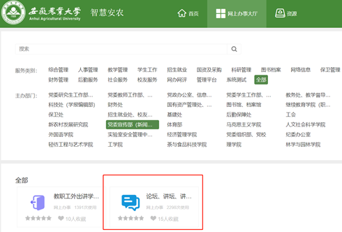 1.教师提出申请。教师登陆智慧校园,进入网上办事大厅-论坛、讲坛、讲座、年会、报告会、研讨会审批申请,根据活动举办时间,提前一周提出社科学术报告讲座等申请,