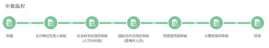 2.各相关单位审批。教师申请经主办单位负责人审核-社会科学处审核-国际合作交流处审核(境外人员)-党委宣传部审核-分管校领导审核后,予以举办。