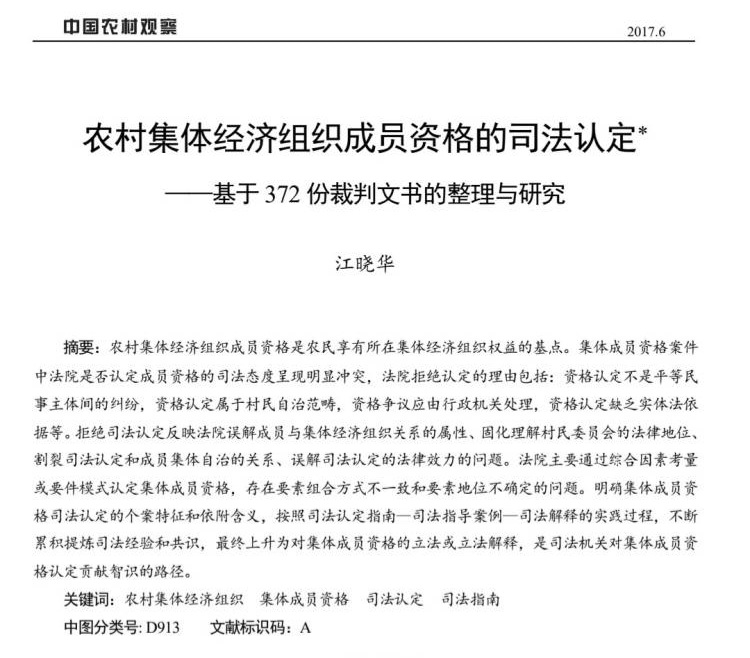 江晓华获奖论文《农村集体经济组织成员资格的司法认定——基于372份裁判文书的整理与研究》,于2017年发表于“三农”研究中文顶刊《中国农村观察》。论文率先关注到集体成员资格案件中法院是否认定成员资格的司法态度冲突现象,基于大量一手资料,详细分析了法院拒绝认定的理由、误区,开展认定的原因、标准和可能问题,进而从集体成员资格司法认定的前提、一般依据、参考因素序列、刚性规范、法律效果等给出相关建议,为我国依法推进乡村治理提供重要参考依据。论文发表至今他引100余次,并被主流媒体报道。