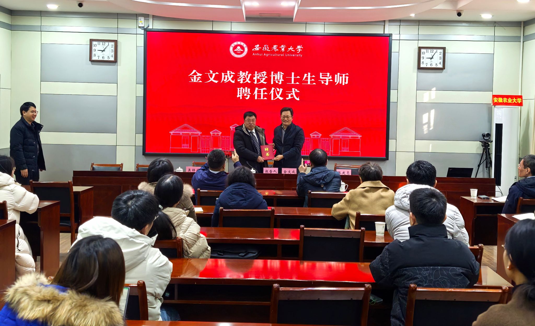聘任仪式上,张庆亮为金文成颁发了安徽农业大学博士生导师聘书。