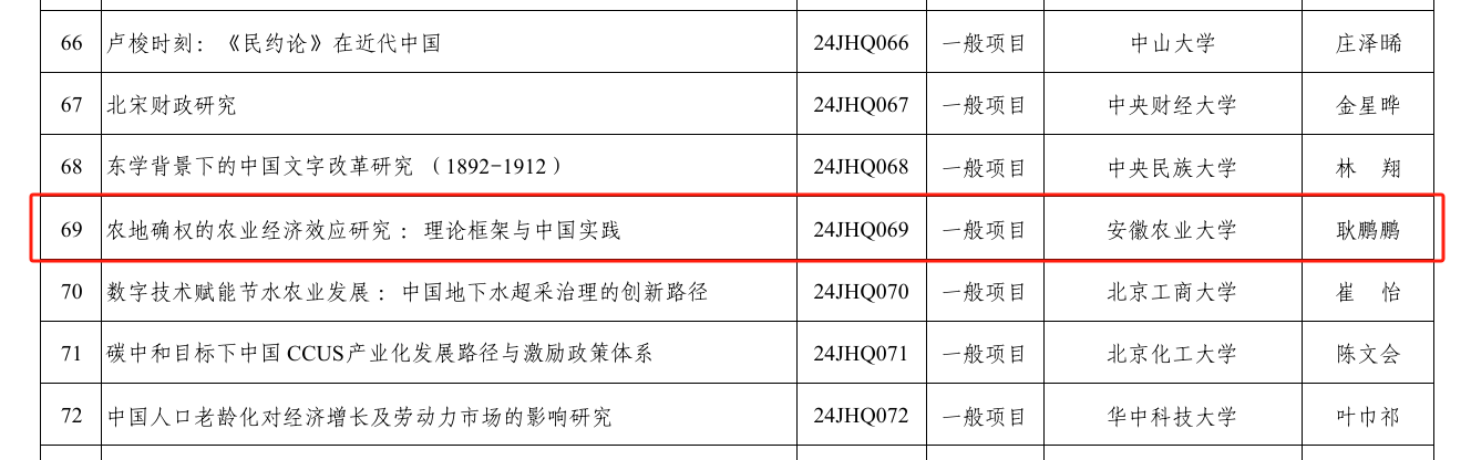 本网讯 近日,教育部下达了2024年度教育部哲学社会科学研究后期资助项目立项名单,全国共计99个项目获批资助。我校经济管理学院耿鹏鹏副教授申报的《农地确权的农业经济效应研究:理论框架与中国实践》获批资助。全国农林高校中,中国农业大学、南京农业大学、华中农业大学和我校获得资助;安徽省属高校中,仅有我校获得资助。