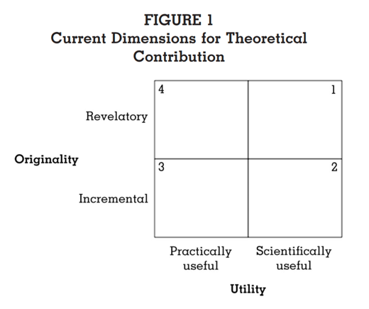 综合现有文献,理论的“增值贡献”(value-added contribution)通常伴随着两个关键维度,Kildfuff将此简洁地表述为:“能够提供重要的[读起来有用]和原创的观点的理论文章就是成功的”(2006:252)。当前发表的理论相关文献表明,贡献指的是通过对某些方面有用(utility)来推进知识进步,并以此为某个现象提供原创性洞见(orginal insight)。