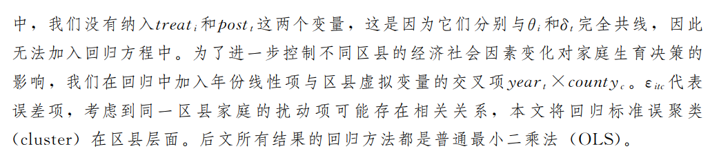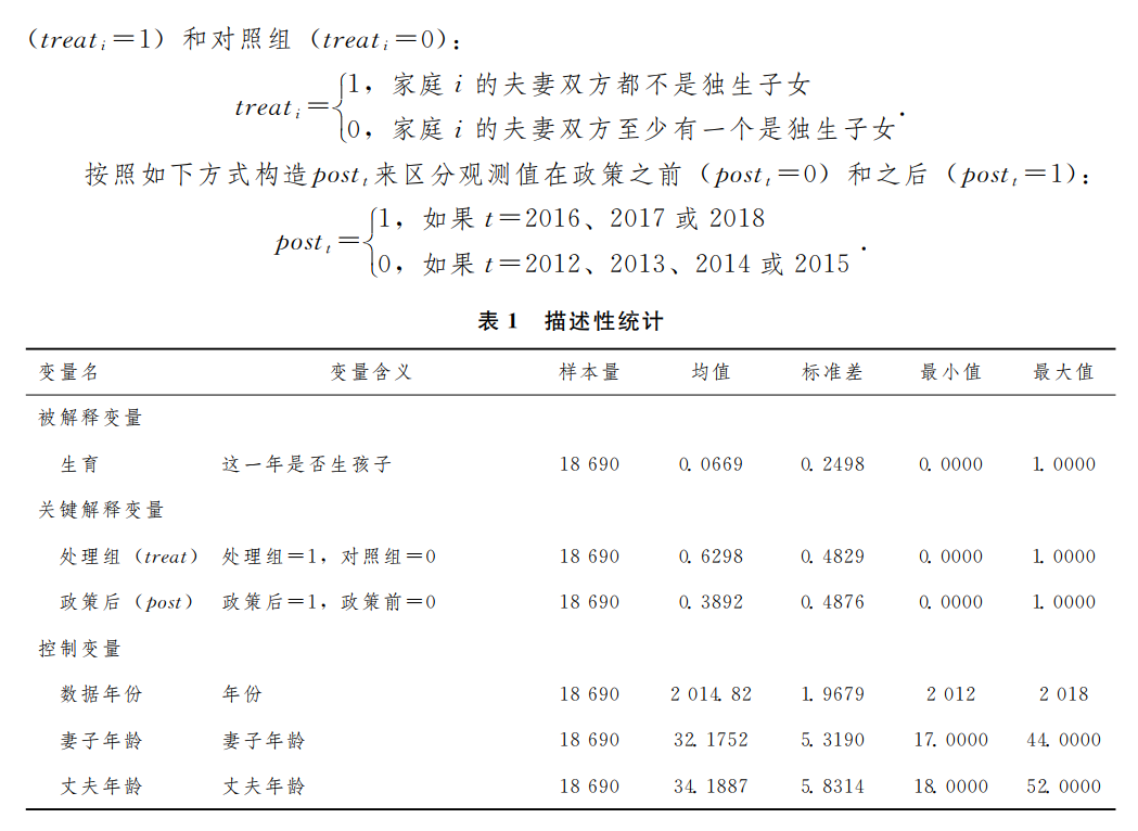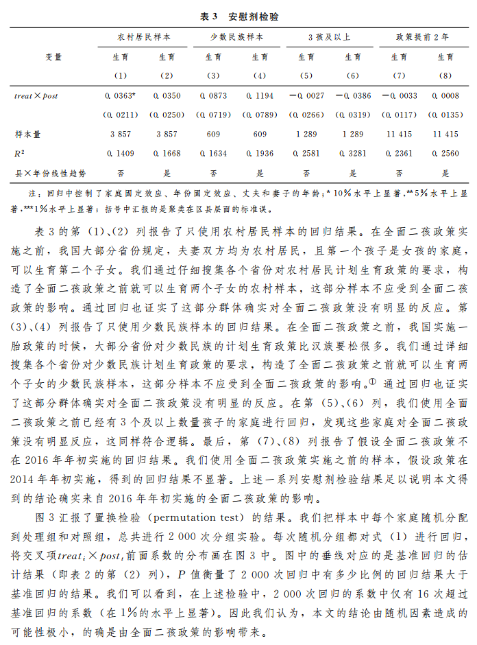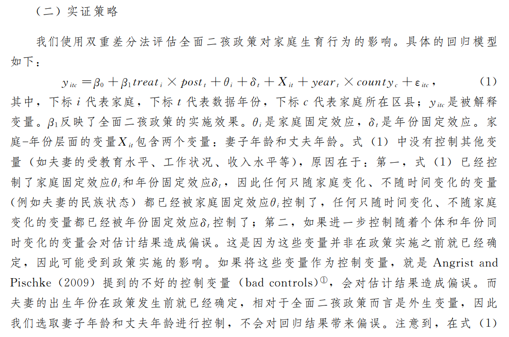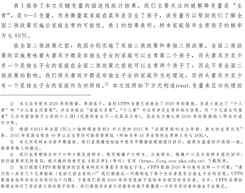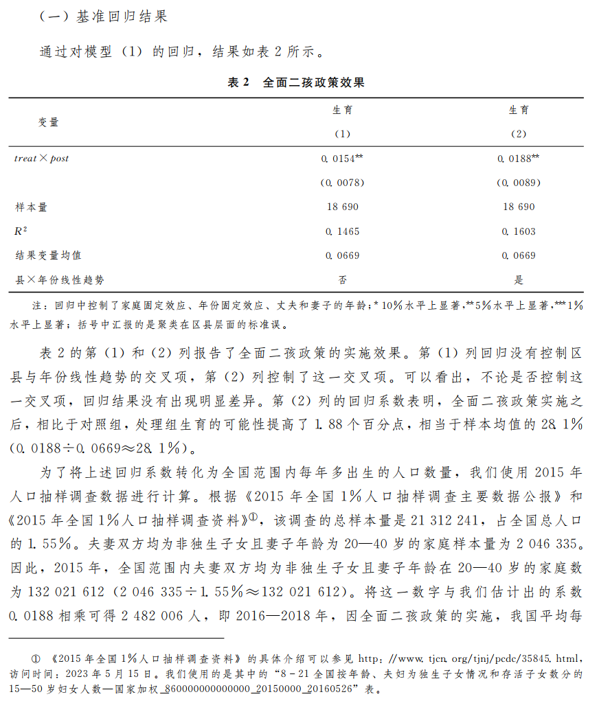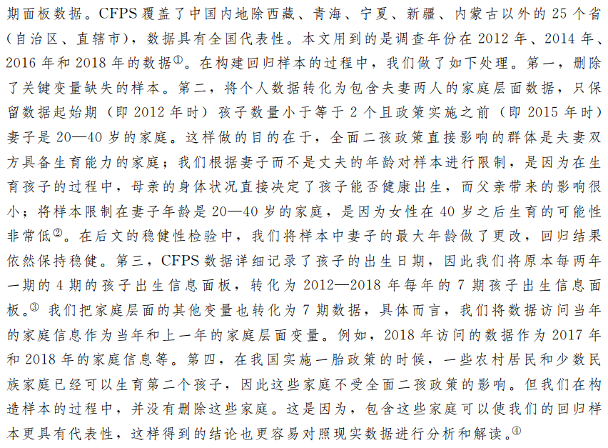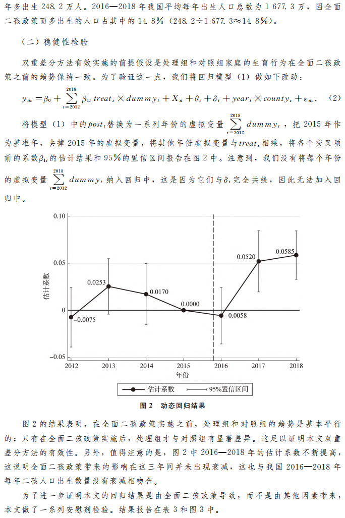3.全面二孩政策作为影响我国家庭生育决策的重要因素,本文的研究补充了现有文献对我国家庭生育决策影响因素的讨论。此外,本文还研究了不同家庭对全面二孩政策的异质性反应,为政府部门制定实施生育配套支持措施提供了研究基础。
