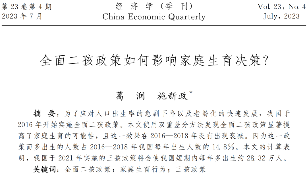 1.以往文献只是在全面二孩政策尚未实施或刚刚实施时,对政策效果进行预测,或是在政策实施后调查人们的生育意愿,而仅有的评估全面二孩政策真实效果的文献也只评估了政策实施刚过半年的效果。本文使用严谨的政策评估方法研究了全面二孩政策实施后更长时间的影响,这不仅能精确地反映出政策的真实效果,还能够刻画出全面二孩政策效果是否具有持续性,帮助我们在更多维度上认识这一政策,弥补了现有文献的不足。