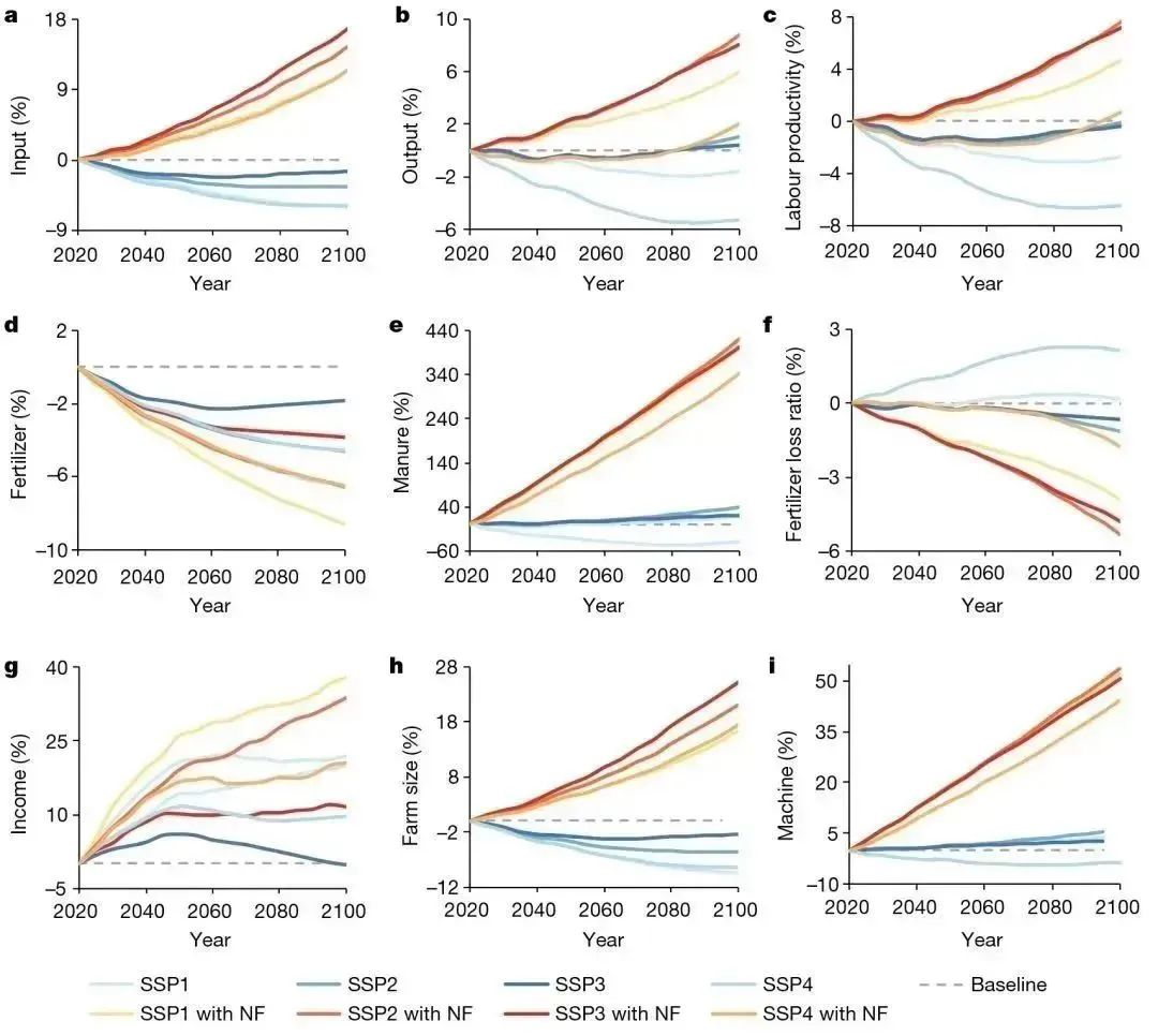 于是,团队又设计模型进行模拟计算。他们发现,如果未来中国能鼓励传统小农持续向新型经营主体转型,农业投入、农地规模和农民收入将在2100年分别比2020年增长约14%、20%和26%,还能减少4%的化肥流失。